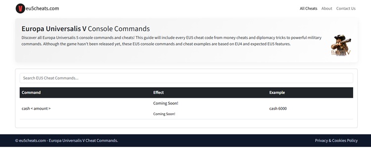 Sadece EU5 hile ve konsol komutları paylaşacağımız web sitemiz yayına başladı. 4 Kasım’da yayınlanacak olan Europa Universalis V için para hilesi, meşruluk, diplomasi, araştırma, yapay zeka kontrolü, yönetim şekli, toprak kazanma, bağımsızlık ve benzeri konsol komutları için sitemizi takip edebilirsiniz.